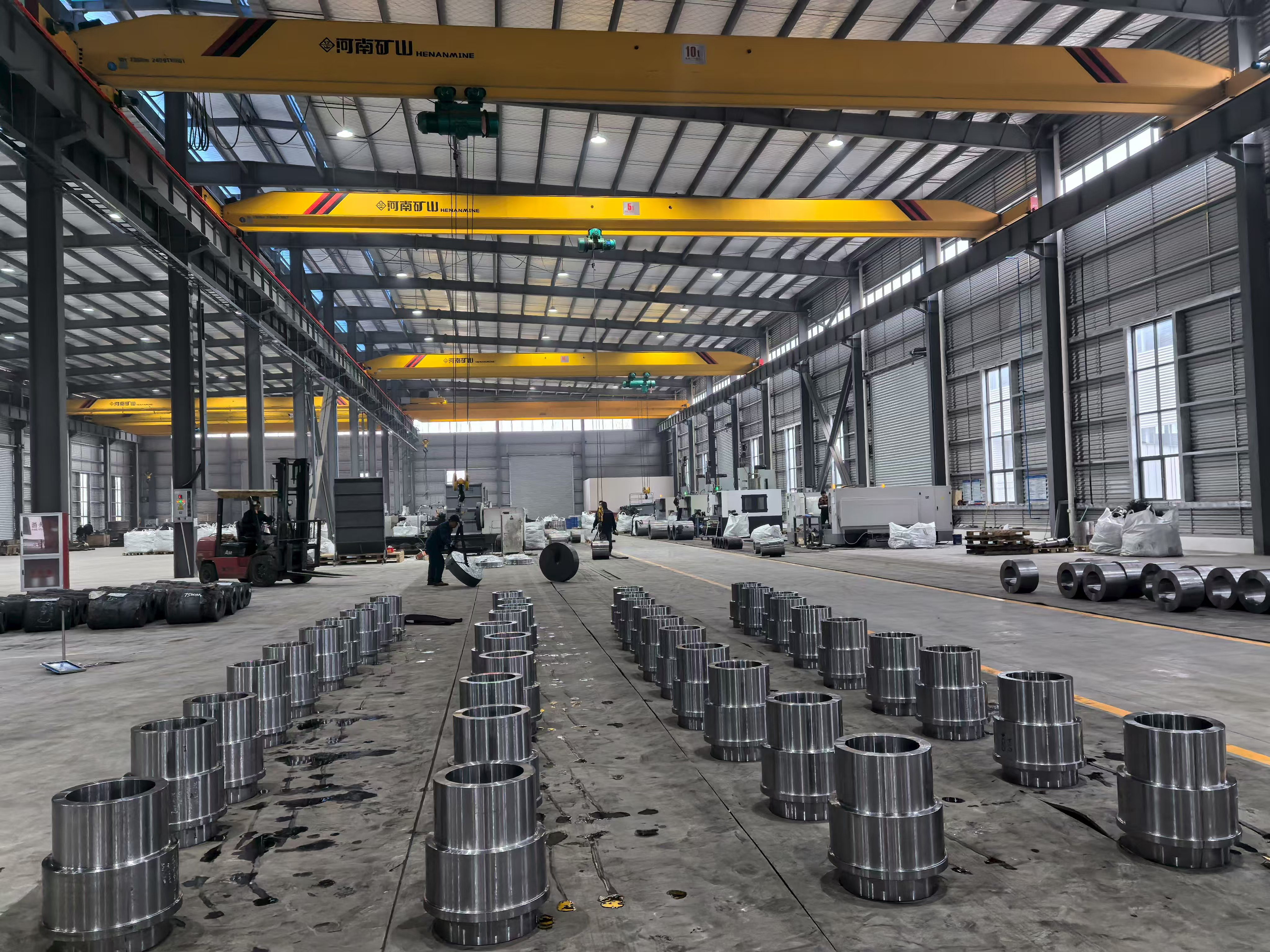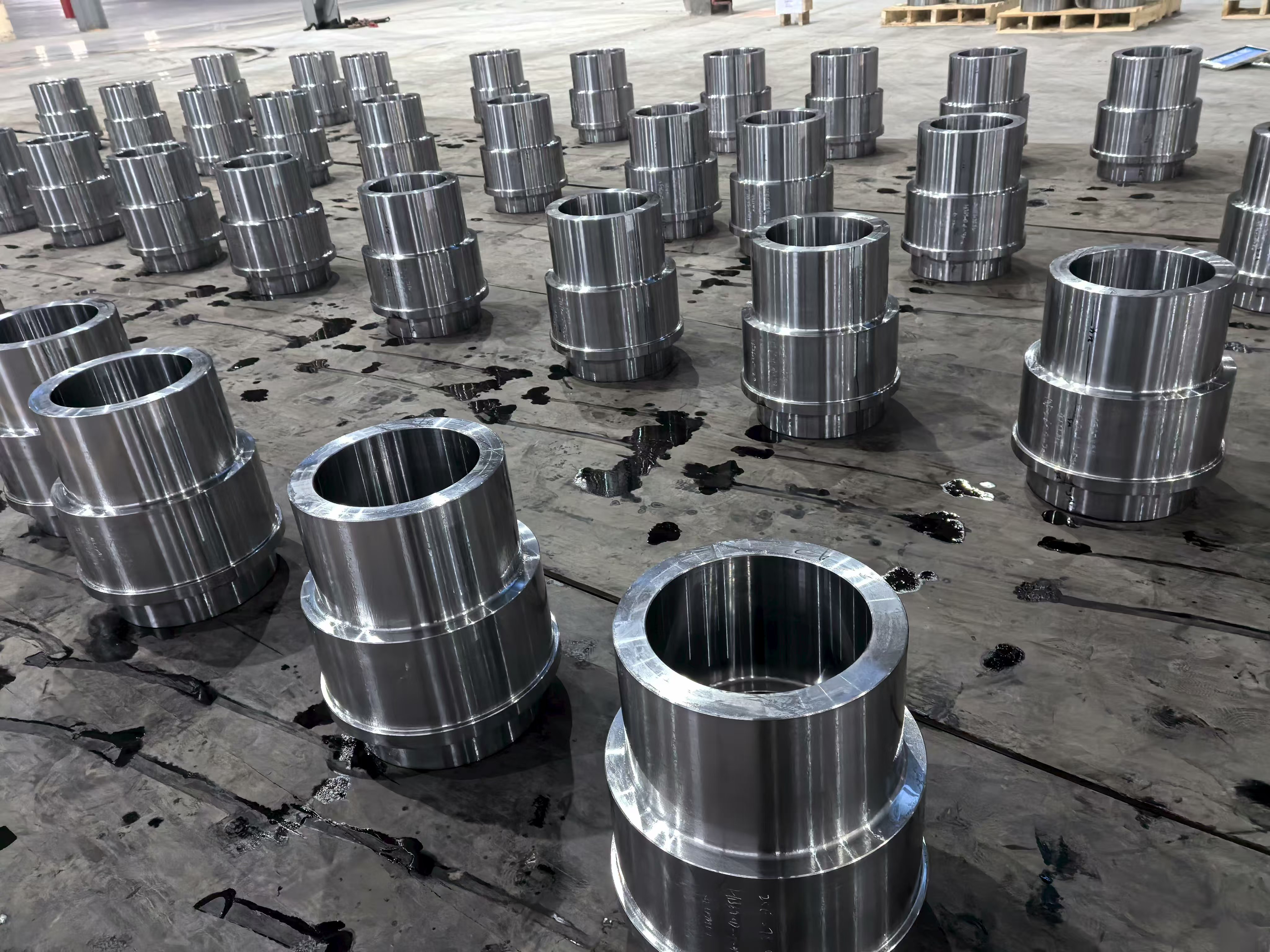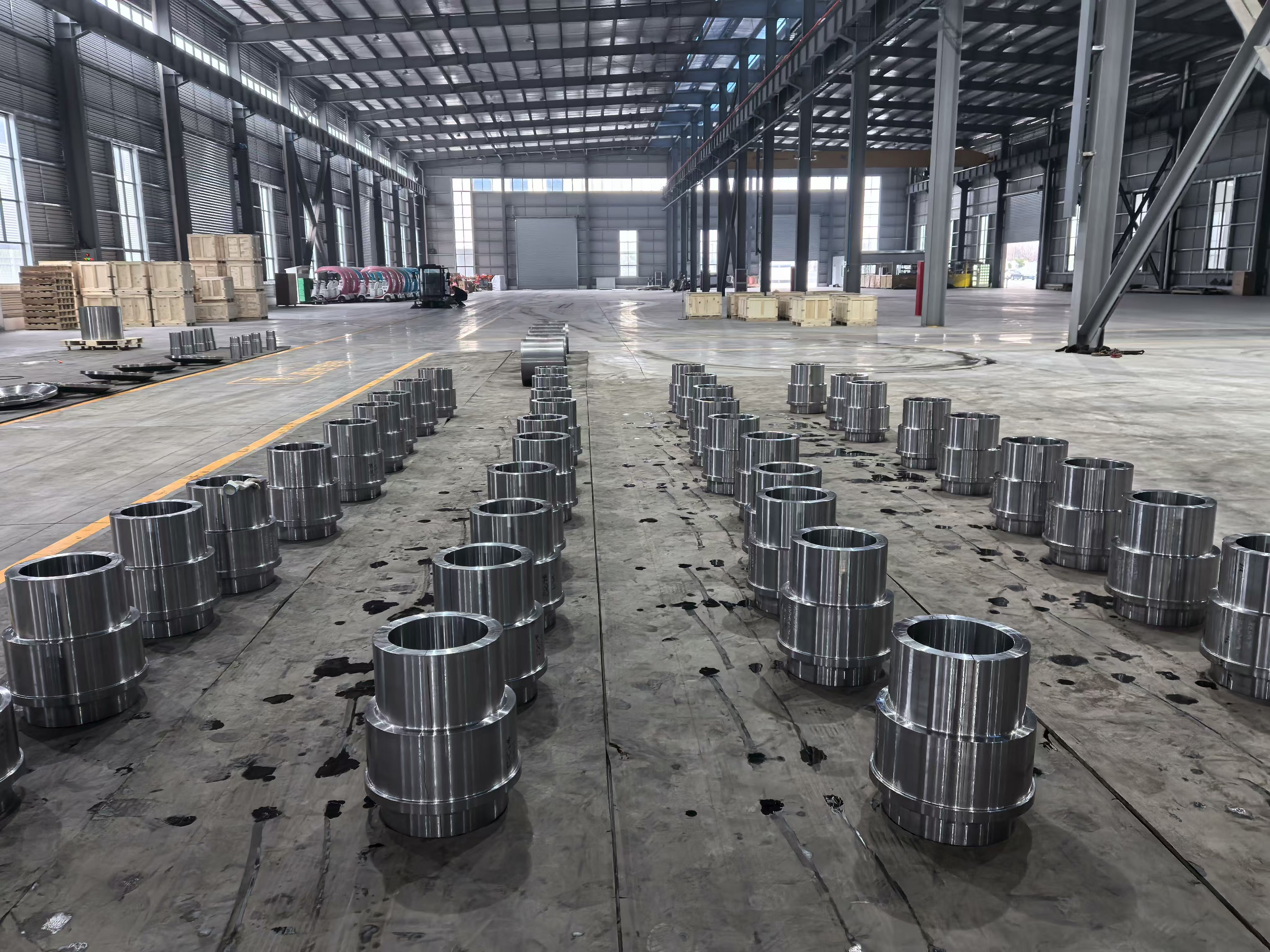 Facilitetsbilleder fra produktionsbasen viser rækker af præcisionsbearbejdede stålring- og navkomponenter lagt ud på tværs af værkstedsgulvet i organiserede batch-arrangementer - et visuelt bevis på koncernens højvolumenproduktionskapacitet. Hver komponent udviser den ensartede overfladefinish, dimensionelle ensartethed og snævre tolerance, der er resultatet af at kombinere smedning, varmebehandling og CNC-bearbejdning i et enkelt integreret produktionssystem. Bearbejdningsværkstedet huser flere CNC-dreje- og bearbejdningscentre, der arbejder samtidigt, med emner lige fra cylindriske muffer med stor boring til komplekse flange-navsamlinger.