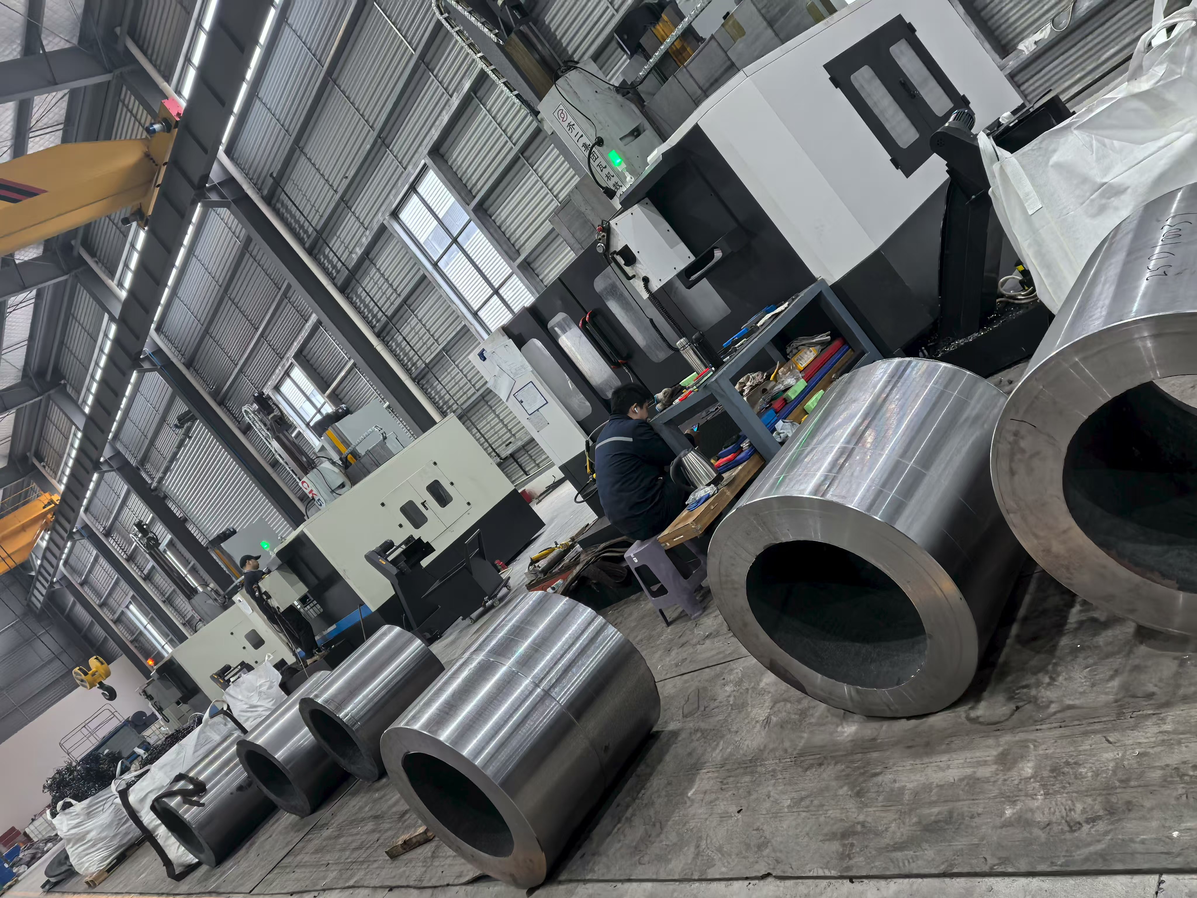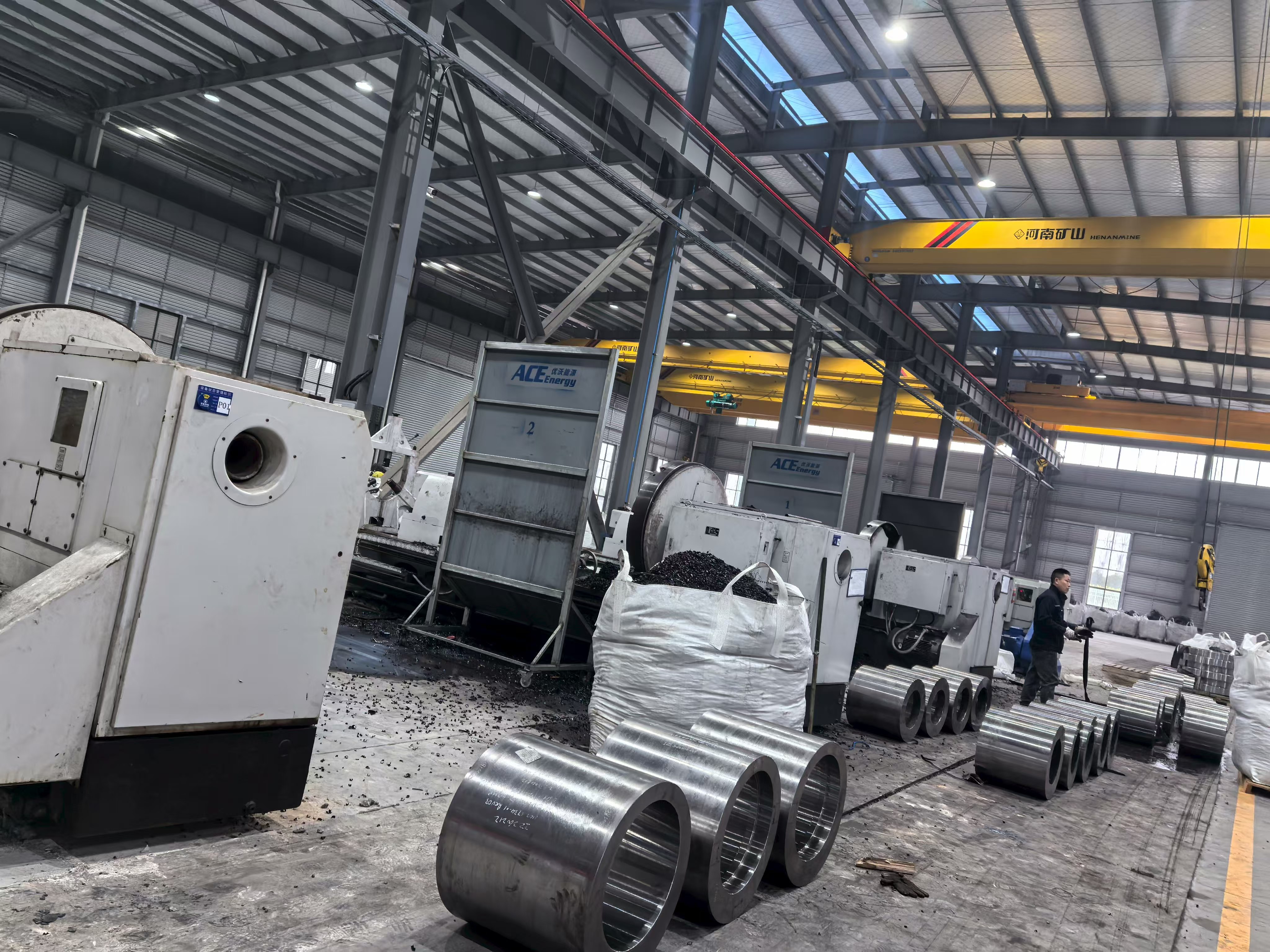 Koncernens primære og største facilitet, denne produktionsbase, er hvor hovedparten af ACE Groups smedning, varmebehandling og præcisionsbearbejdning genereres. Facilitetsfotografering viser omfanget af denne operation tydeligt: Ekspansive høje stålkonstruktionsværksteder udstyret med flere overliggende brokraner, storformat CNC-bearbejdningscentre, der behandler tunge cylindriske komponenter og pænt arrangerede partier af færdige præcisionsbearbejdede dele klar til inspektion og afsendelse. Værkstedets gulvlayout afspejler organiseret flowstyring - råmaterialer og materialer i processen er adskilt fra færdige komponenter, og produktionszoner er afgrænset af gulvmarkeringer i overensstemmelse med lean manufacturing-principper.